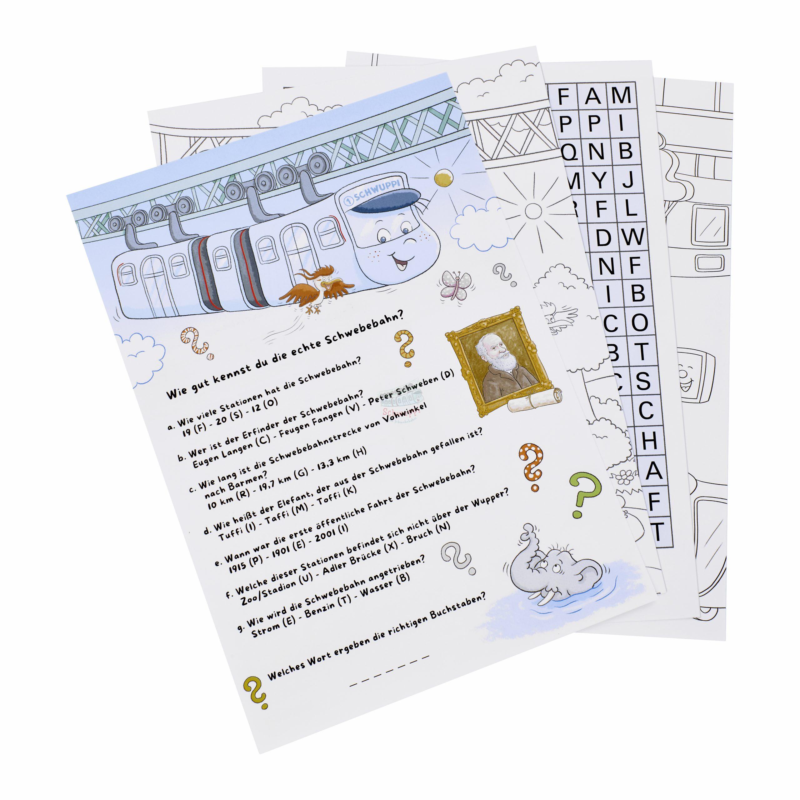 – Rätsel „Wie gut kennst Du die echte Schwebebahn“ und Ausmalbilder der Hauptfiguren zum Ausschneiden und Aufstellen