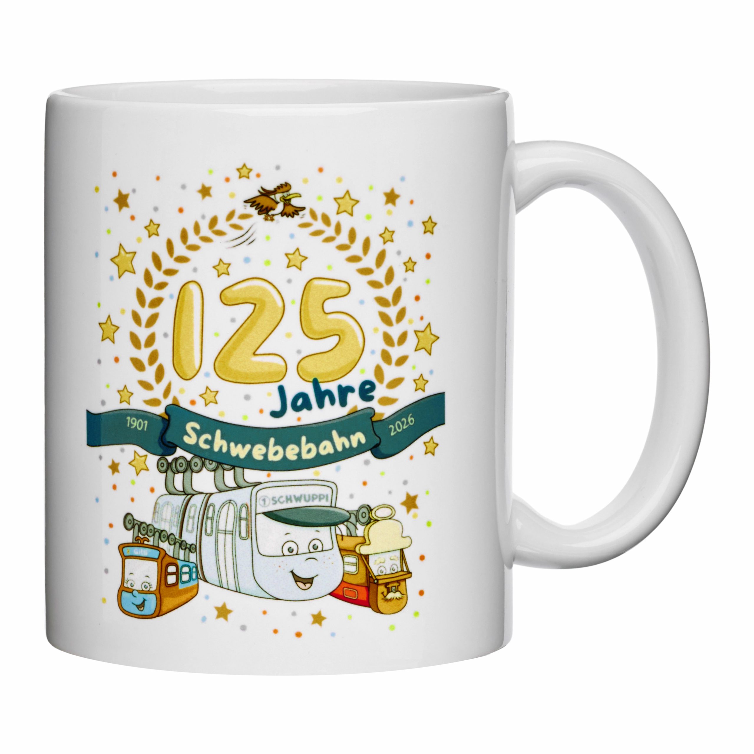 Diese liebevoll gestaltete Jubiläumstasse feiert 125 Jahre Schwebebahn. Schwuppi, Gitti, Pepito und Opa Kaiserwagen begleiten mit feierlicher und liebevoller Illustration durch den Tag und machen jeden Schluck zu einem kleinen Wohlfühlmoment. Die verspielte Gestaltung verbindet das besondere Jubiläum mit der herzlichen Schwuppi-Welt.